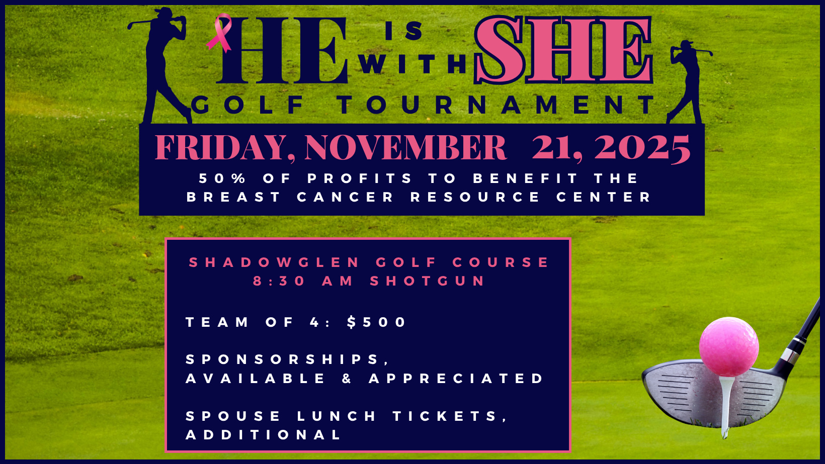 Grab your clubs, gather your team, and join us for HE is With SHE: Golf Tournament—a day of golf, games, drinks, and camaraderie with a powerful purpose. Hosted by SHE: Women in Business, this tournament invites the men in our community to step up and show up for the women in their lives—mothers, daughters, sisters, spouses, colleagues, and friends—by raising critical funds for a local breast cancer resource center. While it may be mostly men out on the course, this event is grounded in our mission to support and uplift women. It’s more than just a game—it’s a statement of solidarity. And we’re here for it.