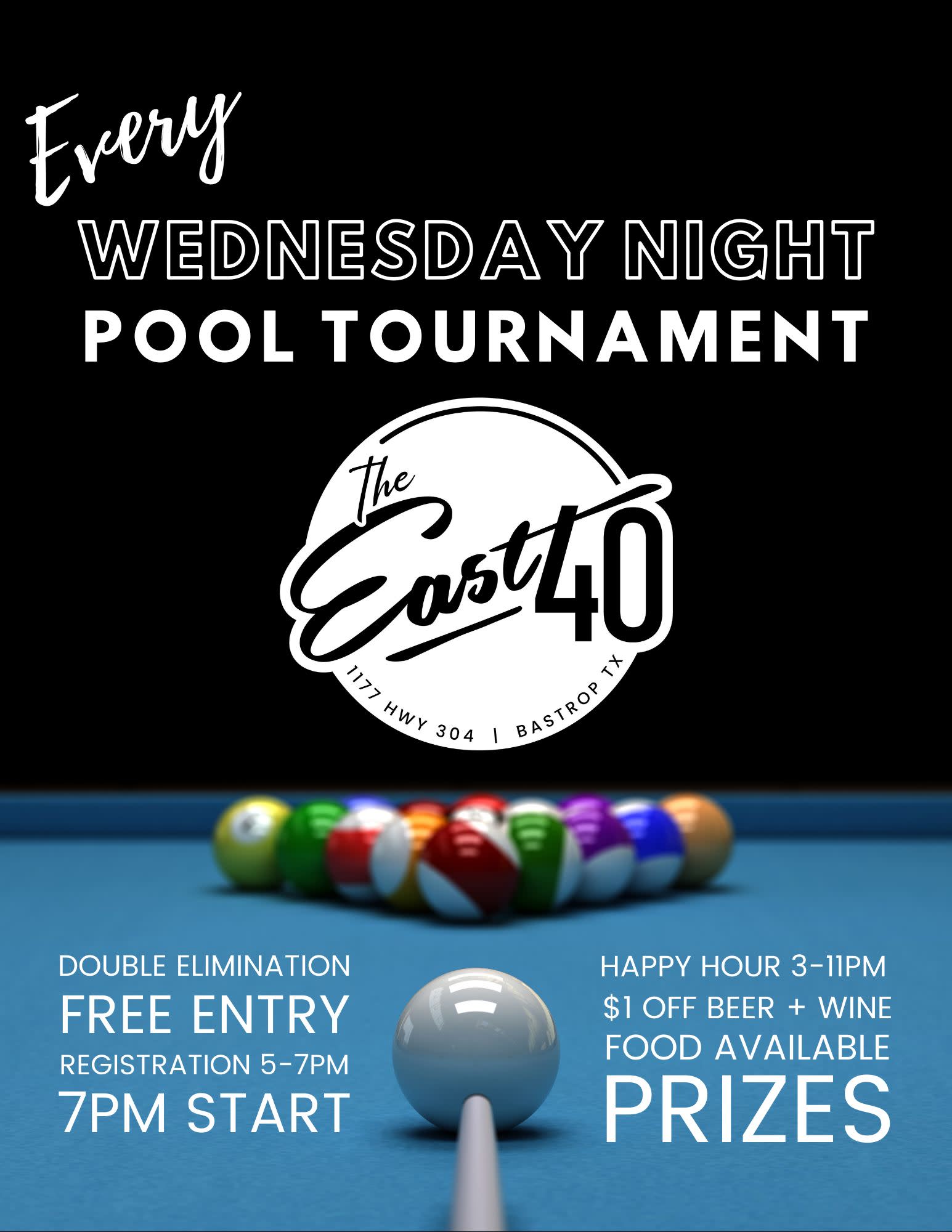 Introducing Wednesday Night Pool Tournaments @TheEast40. - Free Entry! - Registration starts at 5PM - Tournament starts at 7PM - Prizes awarded at end of night! We'll also have Happy Hour from 3PM-CLOSE with $1 off ALL beer and wine.